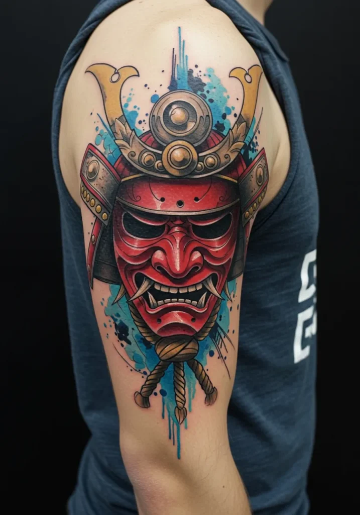 This half sleeve tattoo features a bold red samurai mask with sharp fangs and intense black eye openings, framed by detailed golden armor pieces. The mask has a fierce expression that feels both powerful and mysterious, tied together with thick brown ropes that give the whole piece a solid, grounded feel. Behind the mask, bright blue watercolor splashes create an amazing pop of color, softening the tough look of the mask with a playful, artistic edge. The splash effect adds motion and life without taking away from the strong central design.