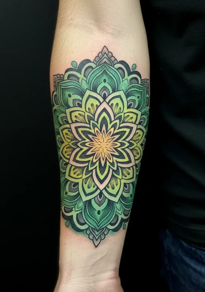 This forearm tattoo showcases a stunning mandala design, blooming outward with layers of delicate petal shapes in vibrant shades of green, yellow, and soft peach. Each petal is beautifully detailed with smooth gradients and sharp black outlines, giving the entire piece a bold yet soft feel. The symmetry of the mandala pulls your eyes right to the center, where the soft orange tones create a warm focal point that gently fades into the cooler greens along the edges.
