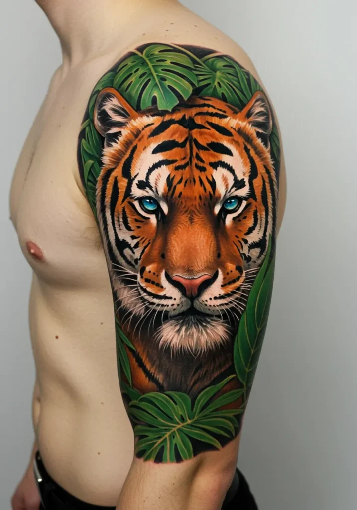 This half sleeve tattoo features a stunningly realistic tiger face, framed perfectly by bold green jungle leaves that wrap softly around the design. The tiger s orange and black fur is so detailed you can almost feel the texture, and those piercing blue eyes give the whole piece a hypnotic, almost magical vibe. The balance between the lifelike shading of the tiger and the rich, flat greens of the leaves creates such a beautiful contrast, making the tiger stand out as the star of the show.