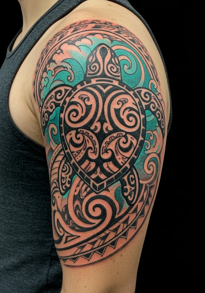 This half sleeve tattoo features a beautifully detailed Polynesian sea turtle surrounded by swirling ocean waves in soft teal and coral hues. The turtle s shell is filled with intricate black tribal patterns that feel both symbolic and decorative, flowing seamlessly into the wave designs that wrap around the arm. The mix of bold black linework with the bright and breezy background colors creates such a cool contrast, giving the whole piece movement and energy.