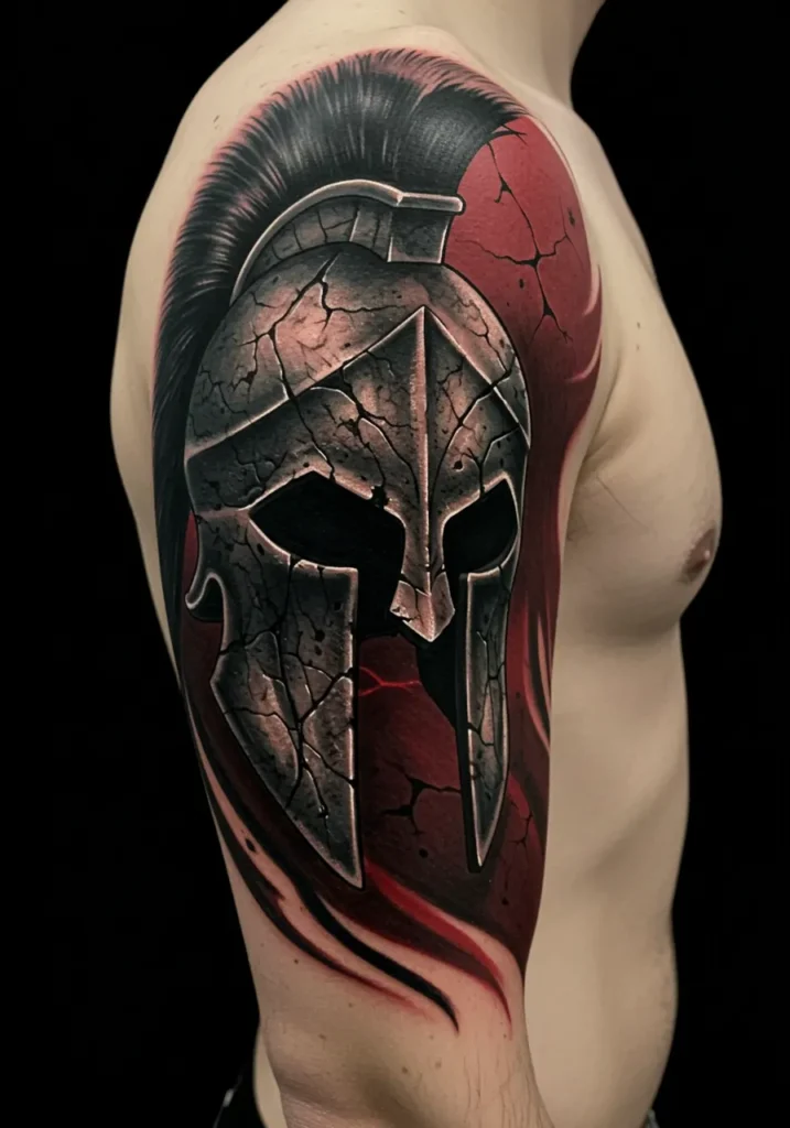 I think this tattoo has such an amazing vibe of strength and resilience. The cracks across the helmet make it feel real, like this warrior has been through everything and still stands tall. I love how the deep reds bring in just the right amount of heat without overpowering the design. It feels tough but artistic, and honestly, it just looks seriously cool.