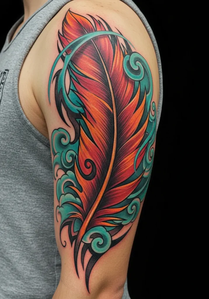 This half sleeve tattoo features a bold and colorful feather as the centerpiece, designed with rich shades of fiery orange and deep red, balanced by cool teal swirls that wrap gently around the edges. The feather itself has sharp, clean lines and beautiful shading that gives it so much movement and life. The teal accents add a playful pop of color that makes the entire piece feel vibrant and full of energy, while the black outlines keep everything crisp and striking.