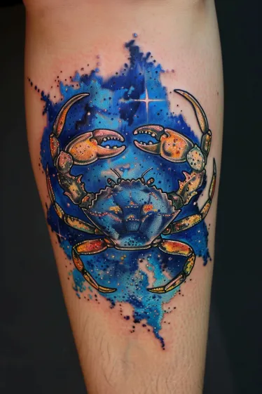 This tattoo is bursting with vibrant cosmic energy, featuring a detailed crab front and center against a dreamy galaxy-blue watercolor backdrop. The shell of the crab shimmers with hints of purples, oranges, and starlit sparkles, while its claws fade into nebula tones that feel straight out of a sci-fi fantasy. The background swirls with electric blues and tiny white dots that mimic stars, giving the entire design a deep space vibe that feels both bold and magical.