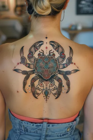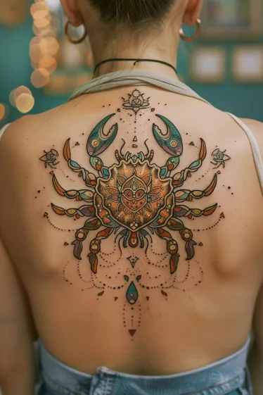 This full back tattoo is pure artistry. It features a regal Cancer crab brought to life with intricate ornamental details, mandala shapes, and jewel-toned colors in gold, teal, and burnt orange. The crab s shell has layered patterns that almost feel like a royal crest, and the delicate dotwork surrounding it gives it a celestial, divine energy. The entire design is perfectly centered on the back, flowing from the upper spine down to the lower back like a crown made for a goddess.