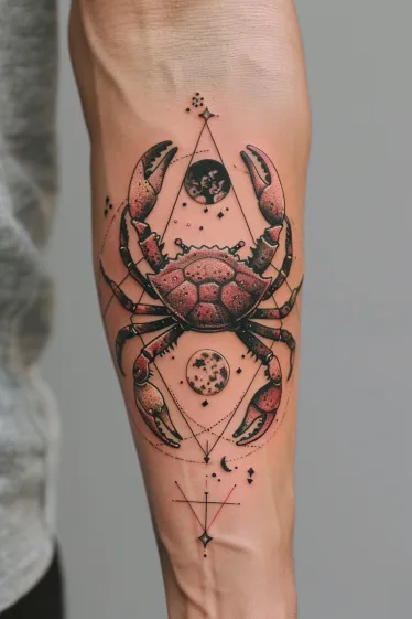 This eye-catching forearm tattoo blends the bold shape of a Cancer crab with sharp geometric lines and mystical celestial elements. The crab itself is shaded in warm tones of red and coral, with a bit of textured detail that makes the shell feel almost 3D. Surrounding it are moons, triangles, tiny dots, and crisp linework that give the whole piece a cosmic-meets-sacred-geometry vibe. It s all super clean and symmetrical, perfectly placed to flow with the arm.