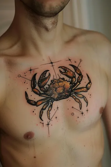 This cosmic chest tattoo features a sharp and shadowy black crab filled with shimmering galaxy textures in burnt orange, deep gold, and soft stardust flecks. The limbs stretch elegantly across the upper chest, with constellations and tiny stars surrounding the crab to give it a dreamy celestial vibe. Everything feels perfectly aligned like the crab is floating in the night sky, lit from within.