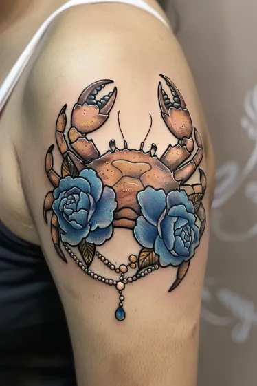This gorgeous upper arm tattoo features a warm-toned crab framed by two deep blue roses and finished with a delicate string of pearl-like beads and a teardrop gem. The crab s shell has soft brown shading and fine detailing, while the roses add a moody contrast with their rich blue petals. The entire design feels perfectly balanced and feminine, with a touch of glam thanks to the dainty jewelry element woven between the florals.