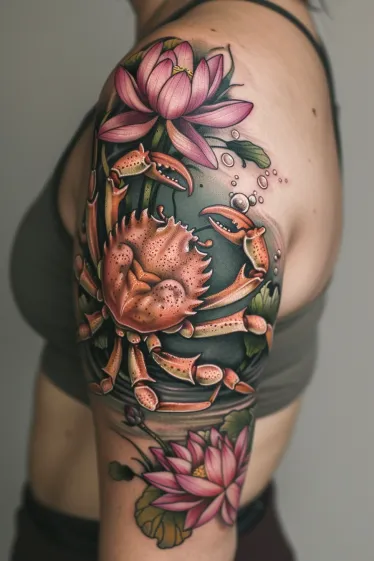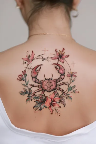 I think this one is absolutely adorable. It s the kind of tattoo that feels feminine without trying too hard. I love how the flowers bring out the gentle side of the crab while still making it feel bold and confident. And placing it on the upper back is just so flattering. It gives major graceful goddess vibes, especially when paired with an open-back top.