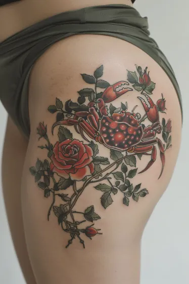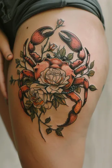 This gorgeous thigh tattoo features a beautifully detailed crab surrounded by soft, blooming roses and leafy vines. The crab s body has a pinkish coral tone that really pops next to the creamy whites and warm greens of the flowers. There s a lovely flow to the design, like the crab and the roses are growing together as one. It s big, bold, and super elegant, with just the right mix of nature and zodiac symbolism.