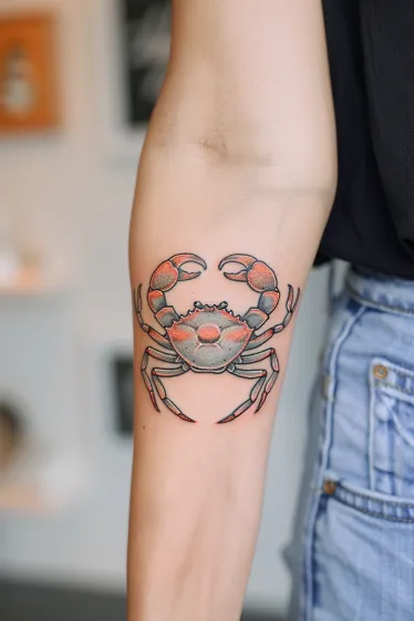 I seriously adore how fun this tattoo is. It has such a fresh and lively energy that just makes you want to smile. The colors are punchy and eye-catching without being overwhelming, and it still totally captures that emotional, ocean-connected Cancer symbolism. If you re into bold tattoos with a playful twist, this one is such a mood. I d rock it all summer long with rolled sleeves and beachy vibes.
