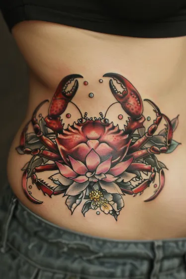 This stunning belly tattoo features a fiery red crab rising from the center of a blooming lotus flower. The lotus petals are layered in shades of dusty pink, gray, and cream with delicate yellow details in the center. The crab s claws curl upward in a bold stance while soft shadowing adds depth to every detail. The way the lotus blends into the crab s body makes it feel like they were always meant to be one beautiful, balanced creation.