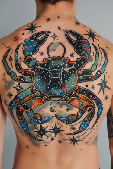 This breathtaking full back piece showcases a galaxy-filled crab in bold cosmic colors like deep navy, glowing orange, and nebula pink. The crab s shell looks like a window into outer space, complete with tiny star clusters and specks of light scattered across its limbs. Surrounding the crab are twinkling stars and celestial orbs that create a sense of movement and magic. The symmetry is on point, and the overall layout makes the entire back look like a glowing galaxy in motion.