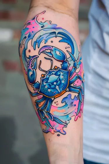 This bright and playful forearm tattoo features a vibrant Cancer crab swirling through a mix of crashing waves and dreamy pastel splashes. The crab is inked in bold shades of electric blue with hints of purple and aqua, outlined with thick black lines that give it that fun cartoon-meets-new-school vibe. The background is full of pink and lavender watercolor-style motion that feels almost like cotton candy waves, wrapping around the crab in the cutest chaos ever.