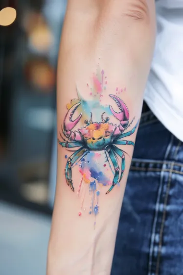 This playful forearm tattoo features a colorful crab brought to life with splashes of dreamy watercolor shades. The crab s body is a vibrant mix of turquoise, pink, and sunny orange, all outlined with soft black lines that keep it defined without being too harsh. Behind it, the background feels like a pastel paint explosion in all the best ways, fading from purples to blues to warm peachy tones. Everything about it feels fluid, expressive, and totally unique.