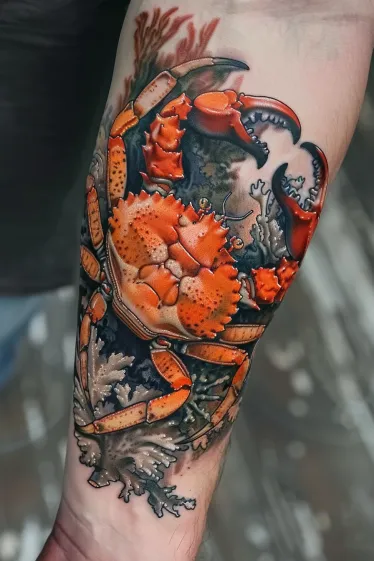 This forearm tattoo is a bold showstopper with a hyper-realistic orange crab nestled among detailed coral branches in muted grays and reds. The crab s shell has a textured, almost armored look with crisp highlights that make it pop right off the skin. The claws are raised in a fierce pose, surrounded by layered sea textures that give the whole piece depth and drama. The way the coral wraps around the crab creates this super immersive undersea moment.