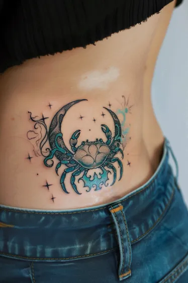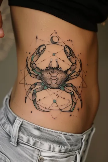 I think this one is absolutely gorgeous. It feels thoughtful and artistic but still totally wearable. The geometric elements give it that modern edge while the crab keeps it grounded in that intuitive, emotional Cancer energy. And let s be honest, a side tattoo always looks a little mysterious and chic. It s like a quiet flex that says, I know who I am, and I look amazing doing it.