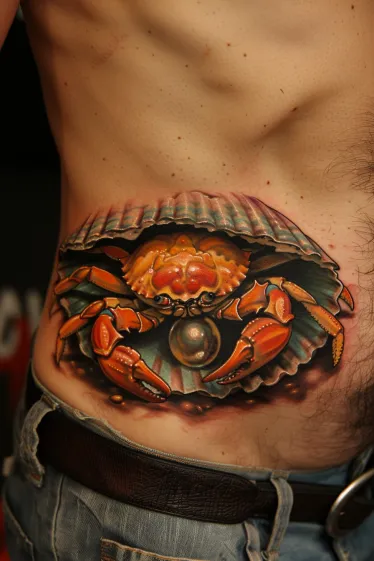 This bold and ultra-realistic tattoo features a bright orange crab tucked inside a detailed green and brown seashell. It s placed along the side of the torso and stretches generously across the ribcage, making it impossible to miss. The crab s shiny shell, detailed claws, and the little pearl nestled below give the whole piece a dramatic and slightly whimsical edge. The 3D shading and use of saturated colors make it look like the crab might actually scuttle out at any second.