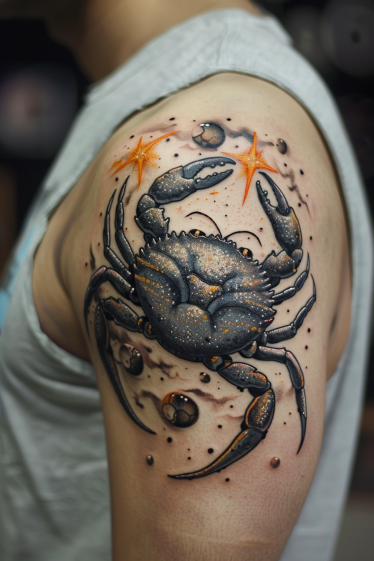 This bold shoulder piece brings a galactic twist to the Cancer crab, featuring a deep charcoal black crab sprinkled with cosmic shimmer that almost looks like stardust. The creature is floating in space surrounded by celestial bubbles, soft gray craters, and two glowing orange stars that instantly steal your attention. The contrast between the dark tones and those vibrant sparkles makes everything pop like a cosmic firework show.