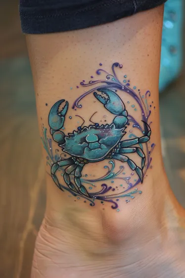 This playful ankle tattoo features a vibrant blue Cancer crab swirling inside waves of purple and turquoise. The watercolor style gives the whole design a splashy, flowing vibe that fits the zodiac s water element so perfectly. The crab is cute but confident, surrounded by swirls and droplets that make it feel like it s dancing through the ocean. It s compact but full of energy, and the colors are just chef s kiss.