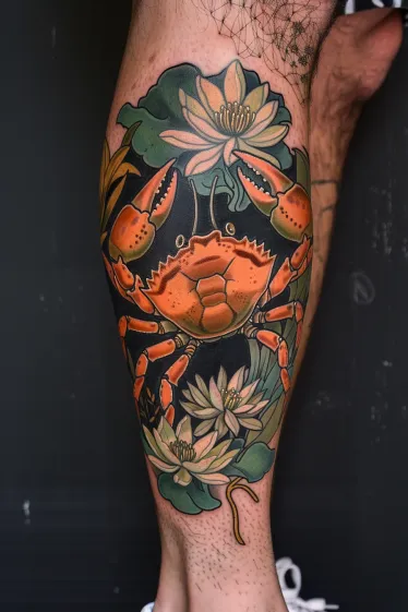 This striking calf tattoo features a bold orange crab surrounded by blooming lotus flowers and deep green leaves, all done in a clean neo traditional style. The crab s shell is rich in warm tones and full of detail, with sharp claws extending into the floral background. The lotuses add a soft elegance that perfectly contrasts with the strong shape of the crab. Thick outlines and a dark backdrop give it depth, while the composition flows naturally down the leg.
