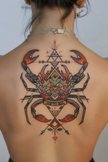 This stunning back tattoo features a Cancer crab brought to life with sharp lines, angular symmetry, and deep jewel-toned shades. The crab is built from layers of geometric shapes and tribal-inspired patterns, with its claws raised in a strong, confident pose. The design stretches across the upper back and flows beautifully down the spine, creating a striking vertical balance. The mix of reds, oranges, and teals gives it an earthy yet mystical feel that s totally mesmerizing.