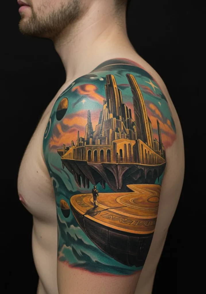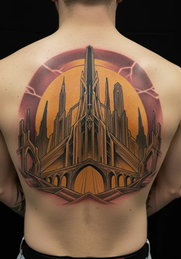 Now this is what I call a full-back statement piece. This stunning tattoo features a golden, otherworldly fortress towering against a glowing sunlit sky clearly inspired by Asgard, the home of the gods. With its long, dramatic spires, endless arches, and layered bridges, the architecture feels both mythic and futuristic at the same time. The symmetrical layout draws the eye upward, while the background bursts with radiant orange and violet hues that give it that ethereal glow.