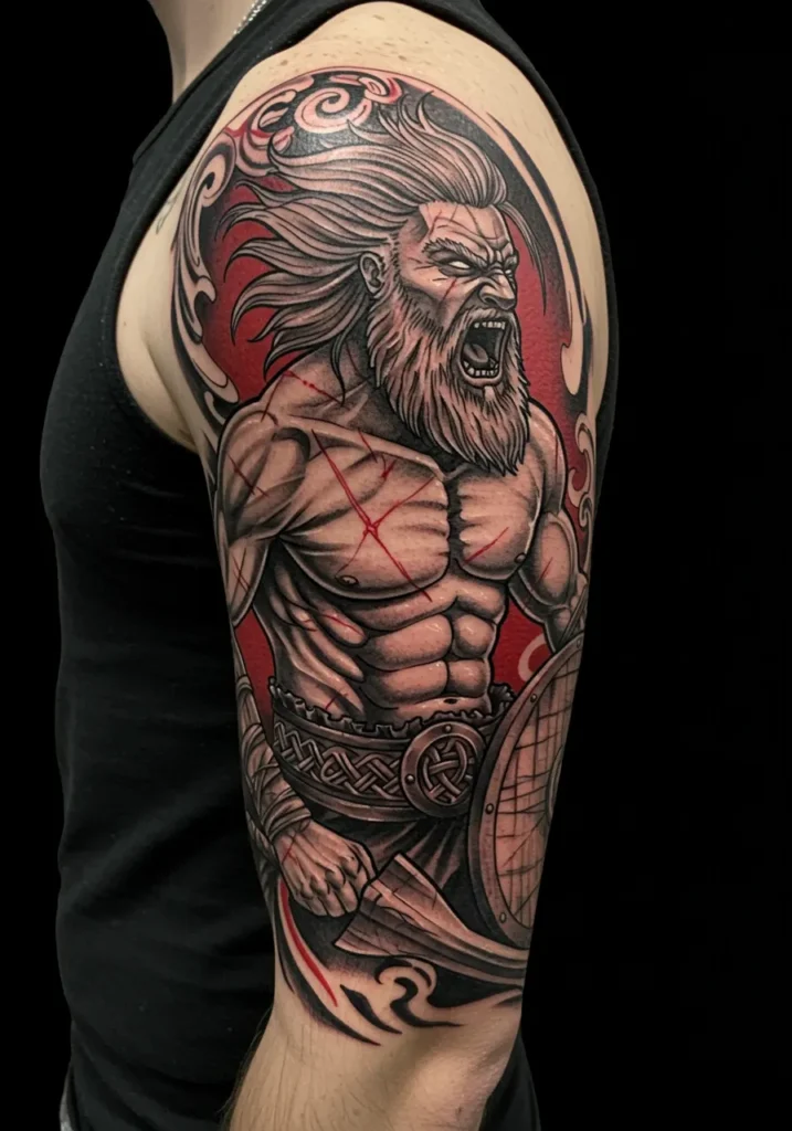 I m totally hooked on the energy of this one. It s intense, yes, but also super clean and stylish. That contrast between grayscale and red is just chef s kiss. It s the kind of tattoo that says I ve seen battle and lived to flex about it. Whether you re into mythology, comic-style boldness, or just want something with serious Viking drama, this piece checks every box.