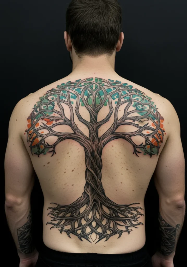 Taking center stage on the entire back is this breathtaking depiction of Yggdrasil, the Tree of Life from Norse mythology. The roots stretch wide and deep, anchoring into the lower back, while the branches fan out gracefully across the shoulders like a living tapestry. Soft greens and warm oranges peek through the interwoven limbs, adding a gorgeous splash of earthy color without overwhelming the natural wood-like tone of the trunk and roots. The knotwork is so intricate it feels almost sacred, like it s telling a thousand-year-old story right on the skin.