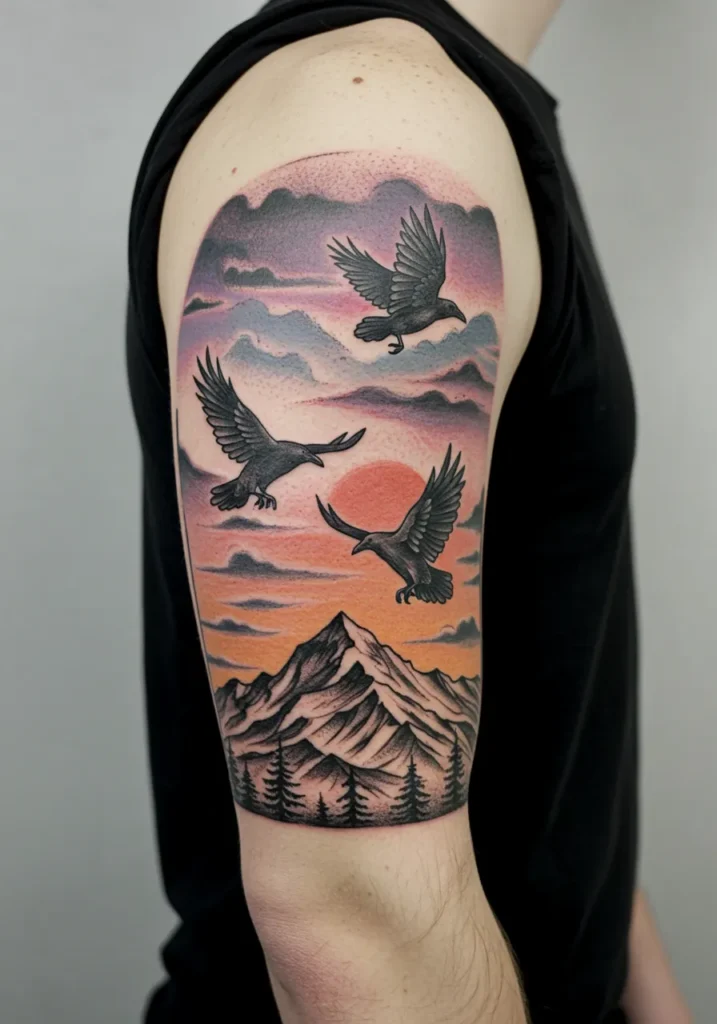 This half-sleeve tattoo is such a vibe. It shows three ravens soaring across a dreamy sunset sky, with jagged mountains and pine trees grounding the scene below. The soft gradient of oranges and purples in the clouds gives the whole piece this quiet, mystical glow like the kind of moment that only happens in the old sagas. The birds themselves are all in crisp blackwork, with perfect wing detail that makes them feel like they re actually in motion.