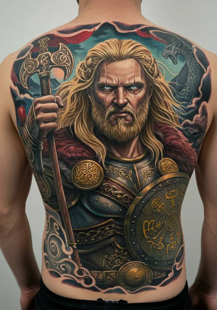 I am completely in awe of how powerful this one feels. It s not just a tattoo it s a whole epic tale inked across someone s back. Every element is so carefully placed, from the runes to the fabric textures. You can tell this is a tribute to bravery, myth, and pure warrior spirit. If you re looking for something that turns your body into a living story, this is that story and then some.