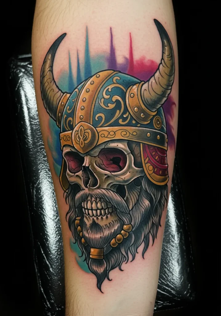 This forearm tattoo takes a dark idea and makes it totally dazzling. It features a Viking skull decked out in an ornate golden-blue horned helmet with swirling details that look straight out of an ancient treasure hoard. His beard is long and braided with chunky beads, and those glowing red eyes? Definitely not here for small talk. Behind him, a dreamy watercolor backdrop in purples, pinks, and teals gives the whole piece this punchy, fantasy-like glow.