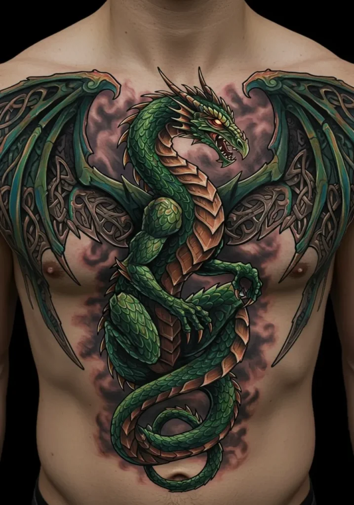 This full chest tattoo is bold, fiery, and just a little bit fierce. Front and center is a massive green dragon, all coiled up and ready to strike, with scales so detailed they practically shimmer. The wings stretch across the chest like armor, decorated with Celtic knotwork that adds that extra layer of myth and magic. And the shading? Wow. The stormy background makes it feel like the dragon is emerging from the clouds, ready to tell its own saga.