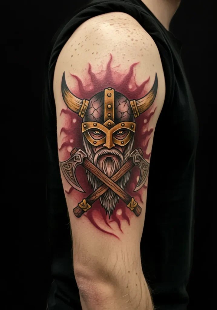 This upper arm tattoo packs a ton of Norse drama into one bold design. Front and center is a cracked Viking helmet with fierce glowing eyes peering out from beneath, surrounded by flames that look like they re straight from Valhalla. Below the helmet, two intricately detailed axes cross over a long flowing beard, giving the whole thing a coat-of-arms vibe with a warrior twist. The gold, bronze, and deep reds create such a fiery, powerful contrast it s basically an epic on your arm.