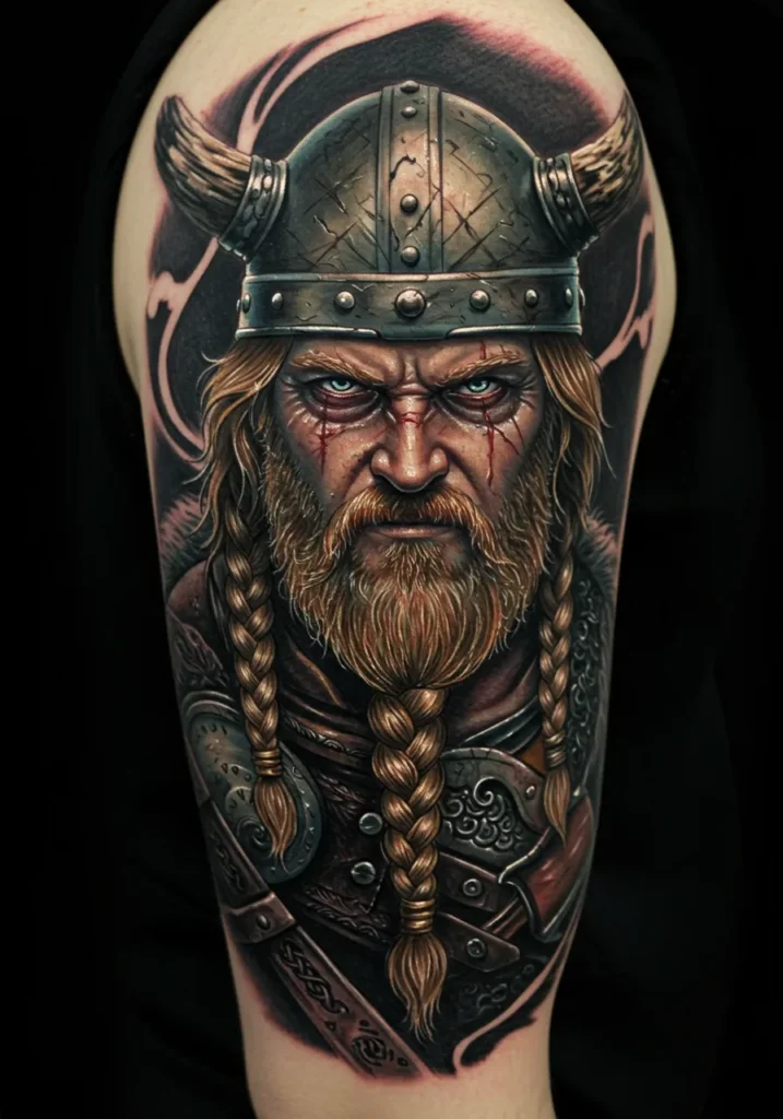 This upper arm tattoo is pure warrior intensity. It features a rugged Viking with fierce, ice-blue eyes that practically burn through the ink. His helmet is battle-worn and iconic, with traditional horned flair and scratch marks to prove he s seen some serious fights. The braided beard, the fur-lined armor, and that blood-streaked face it all adds up to one seriously commanding presence. It feels like he s staring down fate itself.