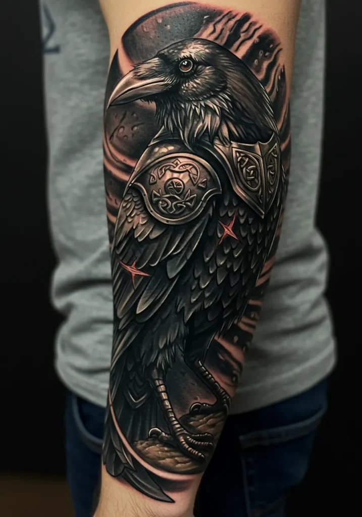 This forearm tattoo is giving serious Norse mystic energy. It features a majestic black raven perched with quiet confidence, but the twist? This bird is suited up in intricately detailed armor. We re talking full-on shoulder plates with knotwork, engraved breastplate, and those tiny red accents that feel like magical battle runes. The background is moody and swirly, almost lunar, pulling everything into this dark, mythical atmosphere that s both beautiful and a little intense.