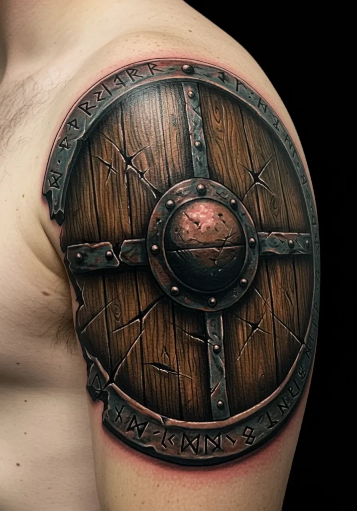 This shoulder tattoo is straight-up legendary. It s a hyper-realistic Viking shield, complete with cracked wood, hammered iron bands, and worn-down rivets that look like they ve seen a thousand battles. The shading and texture are wild like, you can almost hear it thud when you look at it. Around the rim, ancient runes form a protective ring, adding a mysterious and magical touch to the whole piece.