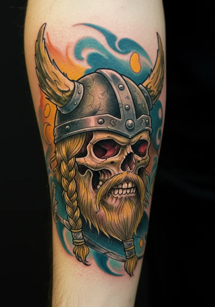 Here s a tattoo that s all kinds of cool and creepy in the best way. It shows a Viking skull rocking a horned helmet and two fierce blond braids, surrounded by bright pops of orange and turquoise that practically glow. The shading on the skull gives it that perfect mix of gnarly and animated, like it s halfway between cartoon and undead warrior. Those red eyes? Yeah, they mean business. And the flames or smoke swirling behind it? Total cherry on top.
