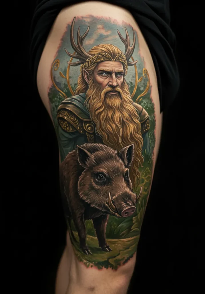 This thigh tattoo is rich with Norse mythology and straight-up fairytale vibes. At the top stands Freyr, the god of peace, prosperity, and fertility, looking regal with his golden beard, glowing crown, and those majestic antlers sprouting from his head like a forest deity. His eyes are so intense they practically tell a story. Below him, a beautifully detailed wild boar likely Gullinbursti stands firm among lush greenery, adding that touch of grounded strength to the divine elegance above.