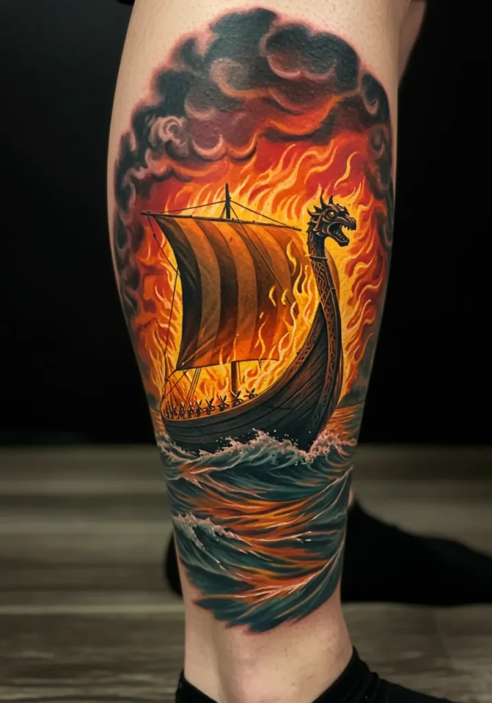 This leg tattoo is pure Norse drama and I love every fiery inch of it. It features a Viking longship engulfed in blazing flames, sailing across stormy waves with the dragon prow snarling toward the sky. The fire is so vivid it practically crackles off the skin, casting that glowing orange light into the clouds above and even reflecting into the ocean below. You can almost feel the heat and hear the crackle and splash it s that dynamic.