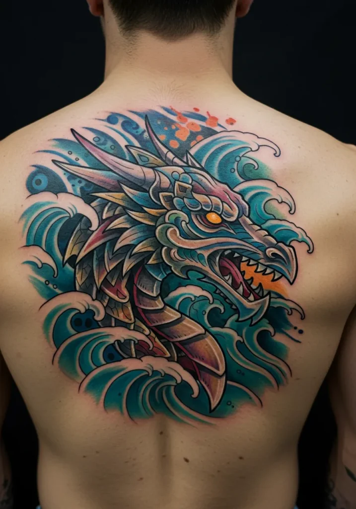 This vibrant full-back tattoo brings the legendary sea serpent Jörmungandr to life in a totally fresh way. With crashing waves swirling around its massive, armored head, the creature s glowing orange eye and razor-sharp fangs make it look like it just surfaced straight from Norse myth. The scale work is super stylized almost dragon-meets-kaleidoscope and the bright turquoise and coral tones give the whole piece this electric underwater vibe.