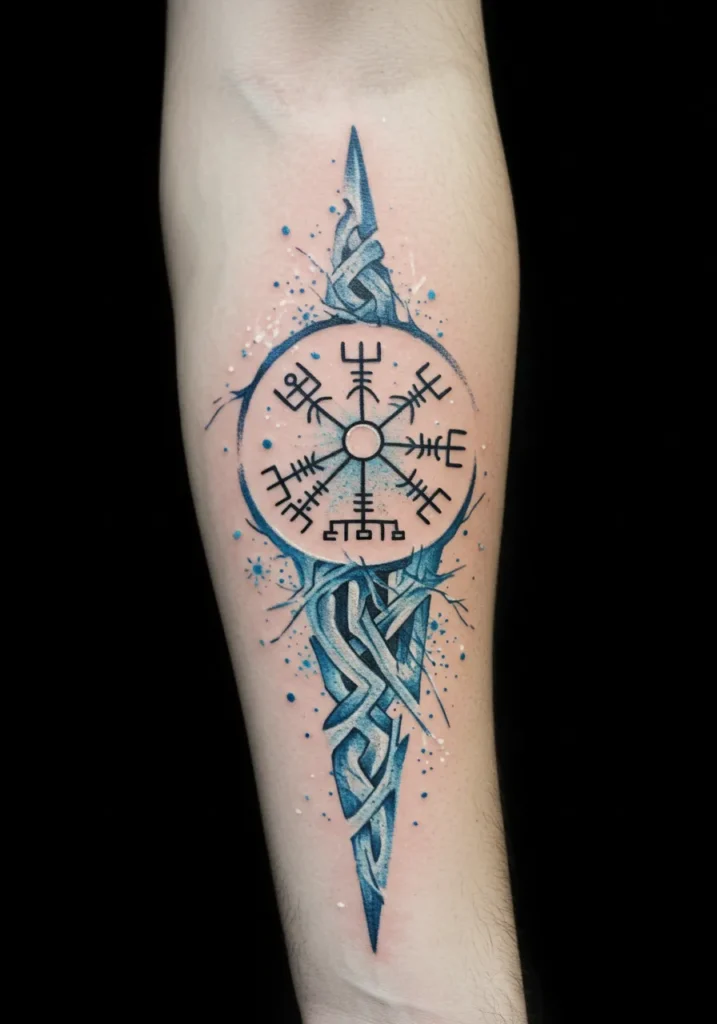This forearm tattoo is giving icy magic vibes, and I am here for it. The central Vegvisir symbol is drawn in bold black lines, wrapped in a blue circular shimmer that looks like frost glowing in moonlight. Behind it, there s a long rune-like spear made of twisted Nordic knotwork, shaded in deep blues and whites with little spark-like splashes around it. It almost feels enchanted, like something you d find carved into an ancient glacier guarded by a frost giant.