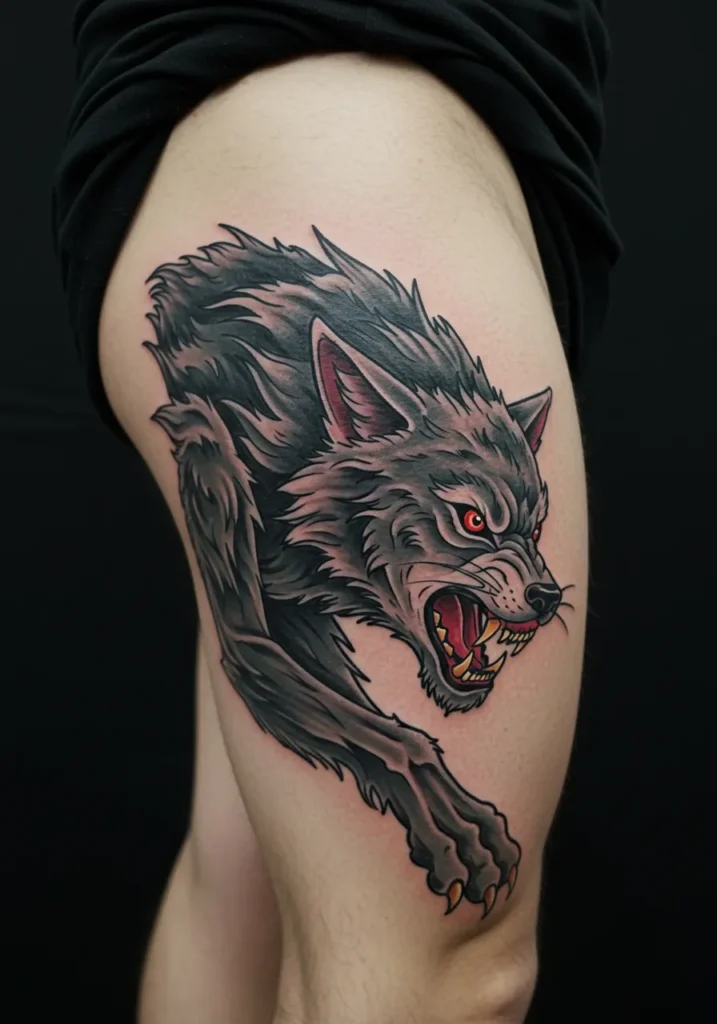 This wild and fierce thigh tattoo brings Fenrir to life in all his mythological glory. With fur flying, eyes blazing red, and jaws wide open mid-snarl, this ink screams pure, untamed chaos. The exaggerated claws, sharp lines, and bold black shading give it that unmistakable Norse edge, while the touch of red in the eyes and mouth adds a perfect hit of drama. It s the kind of design that feels like it s about to leap right off the skin and bite the moon in half.