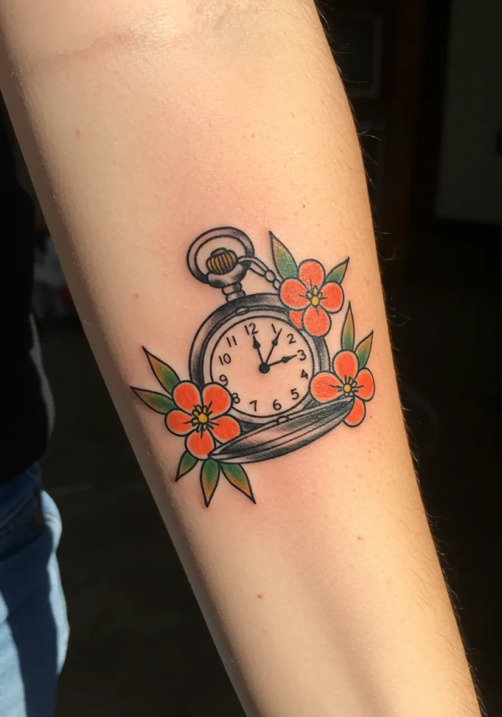 This delicate yet classic forearm tattoo features a pocket watch surrounded by cheerful orange flowers and green leaves. The bold black outlines and muted vintage tones give it that true American Traditional charm. The watch face is detailed but not cluttered, and the floral elements make the whole piece feel balanced and timeless.