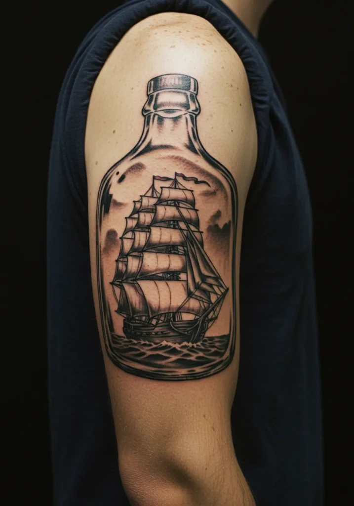 This black and grey tattoo covers the upper arm with a stunning ship sealed inside a glass bottle. The crisp linework and bold shading bring depth to the sails and waves, while the bottle s curved outline gives the piece a framed, almost storybook feel. It s traditional tattoo art at its best, strong, clean, and full of symbolism.
