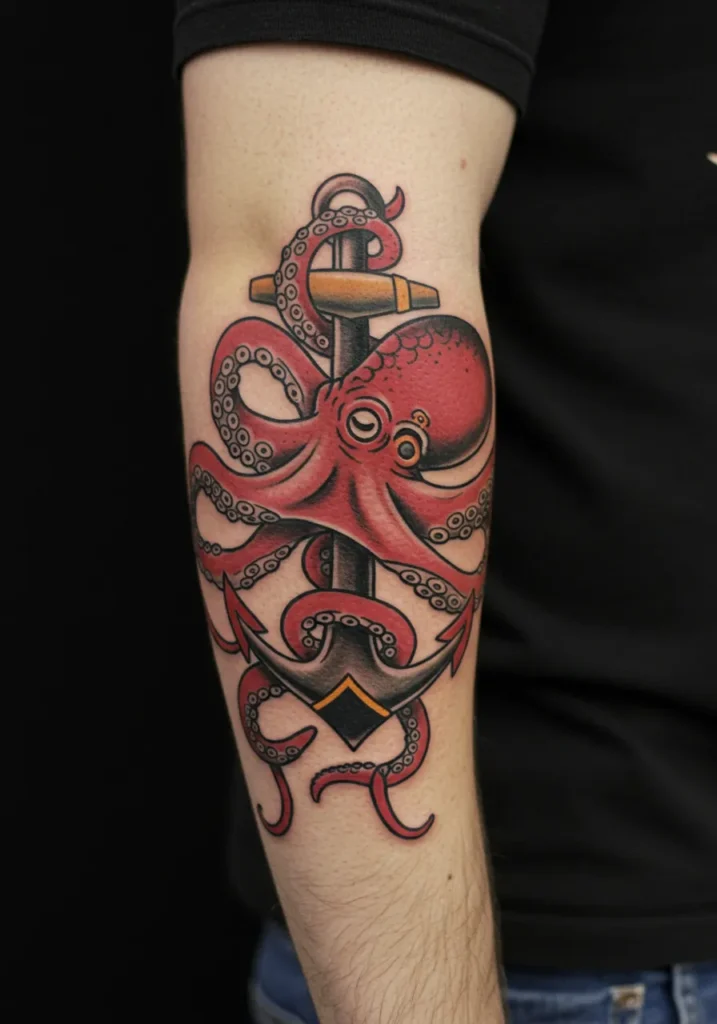 This American Traditional tattoo wraps an octopus around a bold black anchor, placed perfectly on the forearm. The thick black outlines and deep reds contrast beautifully with the subtle orange and yellow tones, giving it that timeless sailor-inspired feel. The tentacles curl around the anchor in perfect balance, creating a dynamic design that flows naturally with the arm.