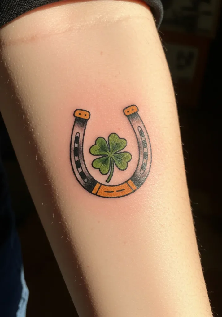 This small American traditional tattoo sits neatly on the upper arm and features a classic horseshoe framing a vivid green four-leaf clover. The bold outlines, warm golden tones, and soft shading give it that timeless vintage feel. It s the perfect size for a medium placement, detailed yet clean, and it pops beautifully against the skin in natural light.
