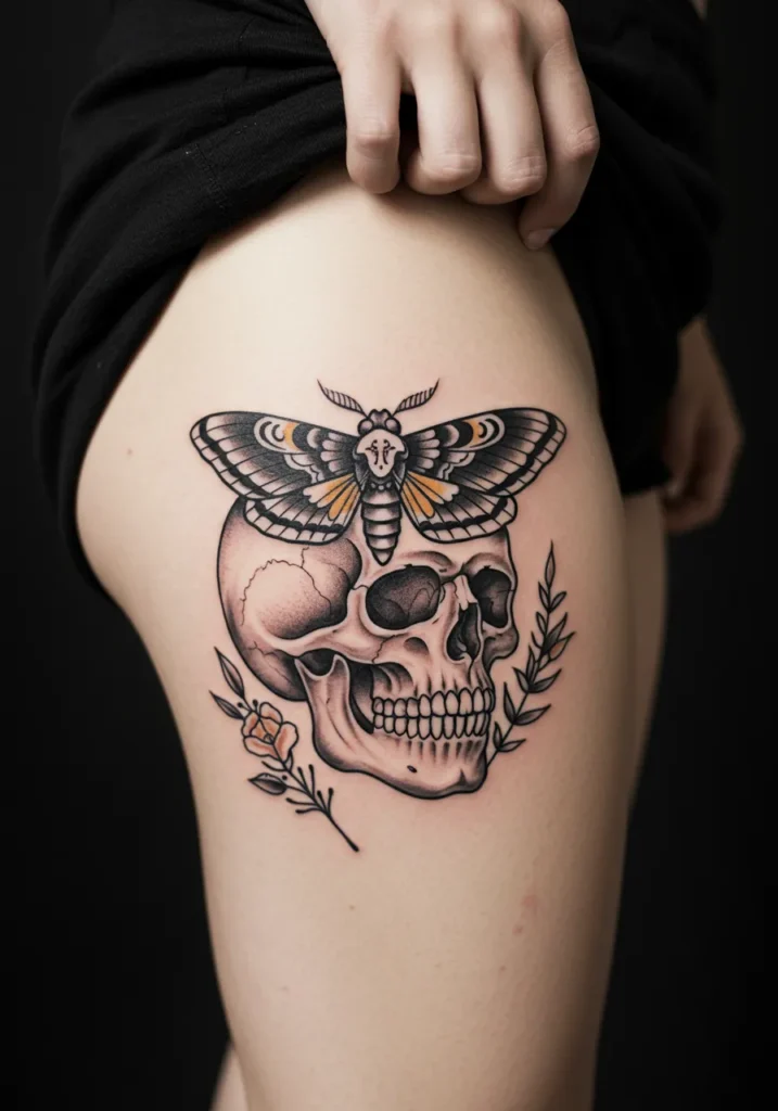 This thigh tattoo pairs a realistic skull with a large death s-head moth resting on top. The black and gray tones of the skull contrast beautifully with the warm touches of gold and cream in the moth s wings. A few small flowers and leaves frame the piece, softening its boldness while keeping that classic American Traditional edge.