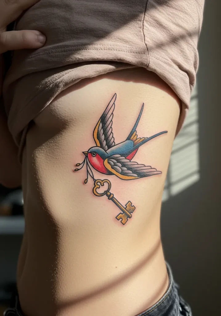 This rib tattoo is all about classic charm. A blue and red swallow takes flight, holding a golden key delicately in its beak. The clean outlines, soft shading, and slightly curved placement flow perfectly with the natural lines of the body. It s simple, elegant, and full of character exactly what makes American Traditional tattoos so enduring.