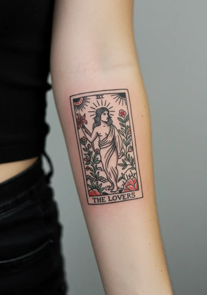 This forearm tattoo reimagines The Lovers tarot card with traditional flair bold black outlines, muted red and green tones, and simple floral details surrounding a graceful central figure. The rectangular frame gives it that tarot authenticity while keeping it crisp and stylish.
