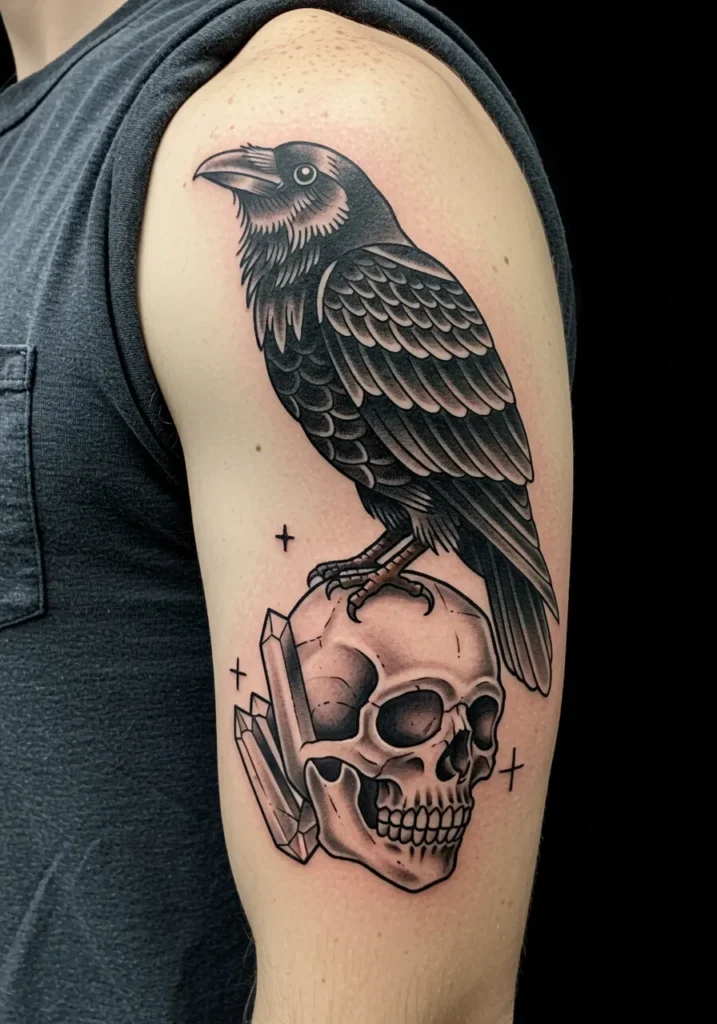This striking shoulder tattoo pairs a dark raven perched on a skull, surrounded by subtle crystal details. The heavy black shading and muted gray tones give it depth, while the precise linework keeps it bold and clean. It s a medium-to-large piece that fits the arm perfectly.